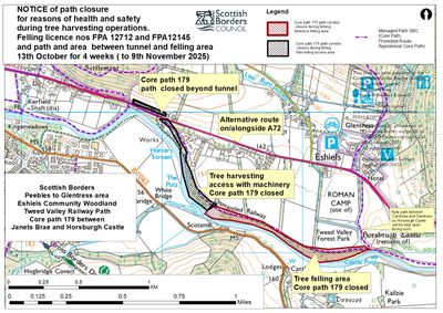 A section of the Tweed Valley Railway Path, which is also NCN1, between Glentress and Peebles will be closed to allow Peebles Community Trust to carry out tree felling in the Eshiels Community Wood, as part of their long-term improvements to the wood, under their approved woodland management plan and for Scottish Borders Council to carry out path surface repairs and improvements. The exact section of path to be closed and diversion can be found using this link: Path closures | Scottish Borders Council